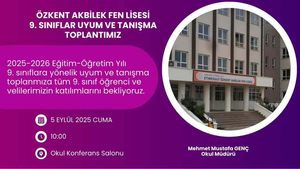 9. Sınıflarımıza yönelik uyum ve tanışma toplanmıza tüm 9. sınıf veli ve öğrencilerimizi katılımlarını bekliyoruz.